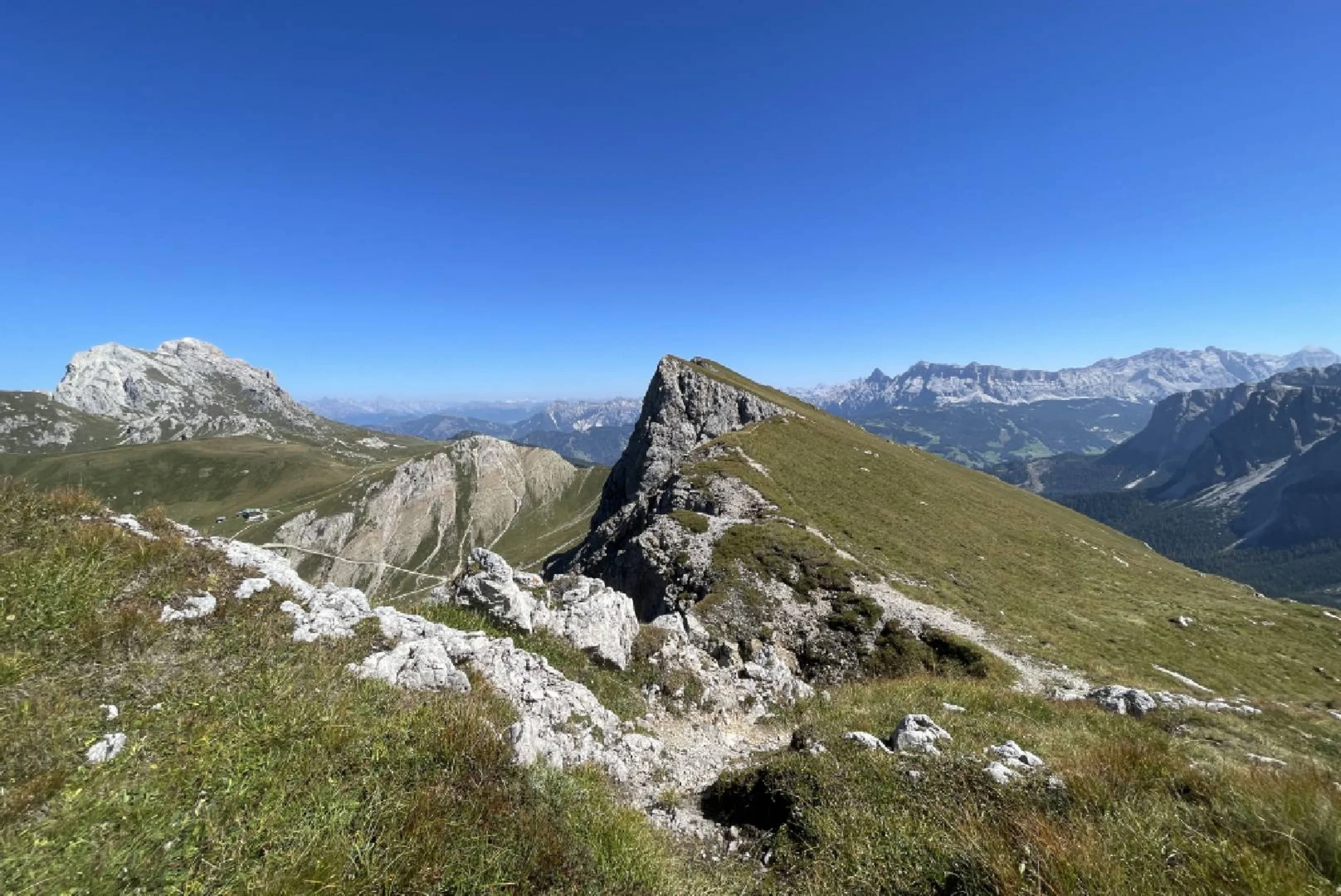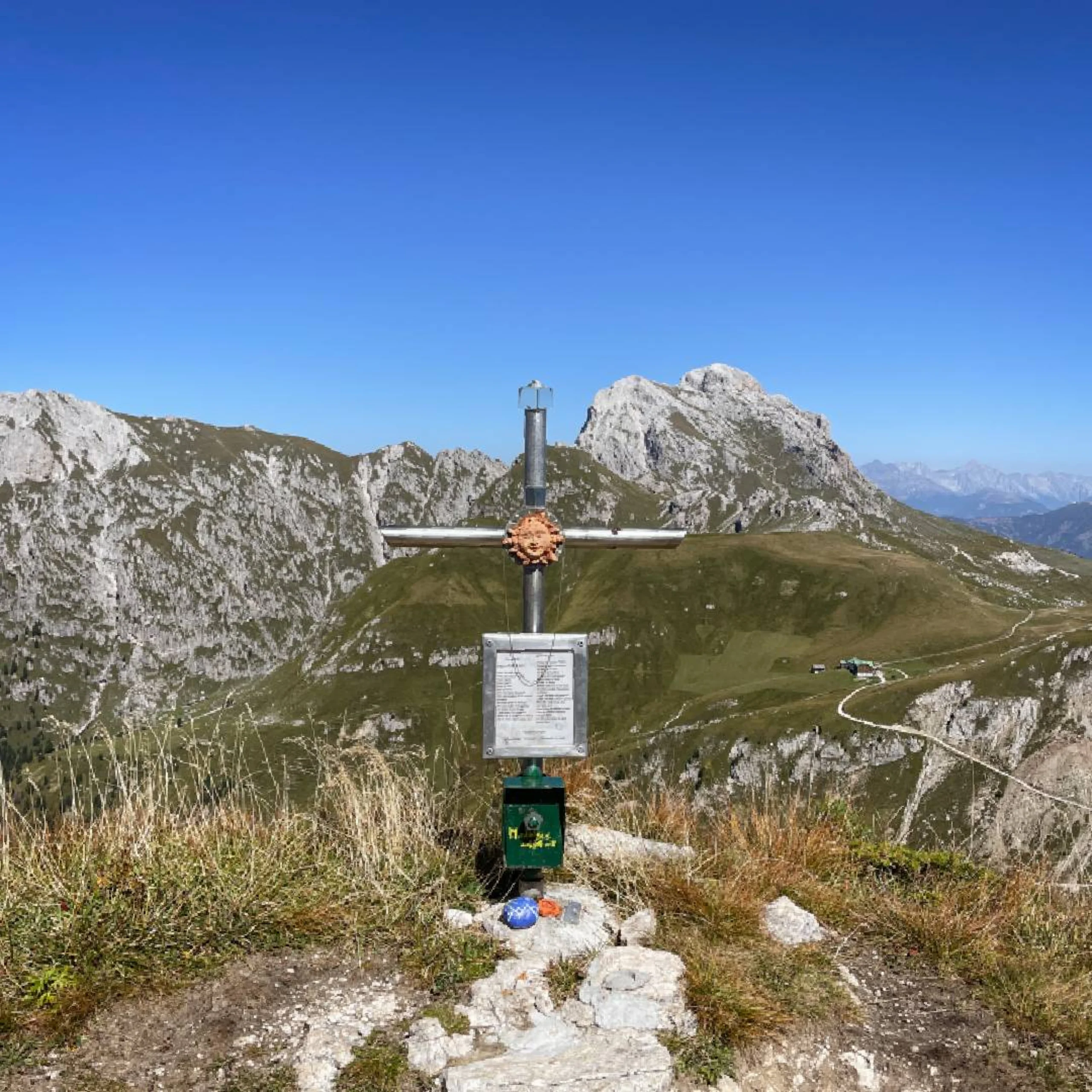 La piccola croce di vetta in ferro si trova poco prima del pendio a nord. Da qui si gode di una vista impressionante sul Sasso Putia, sulle Alpi della Zillertal, sul gruppo delle Vedrette di Ries e sulle Dolomiti: una vista che invita a soffermarsi e a sognare.