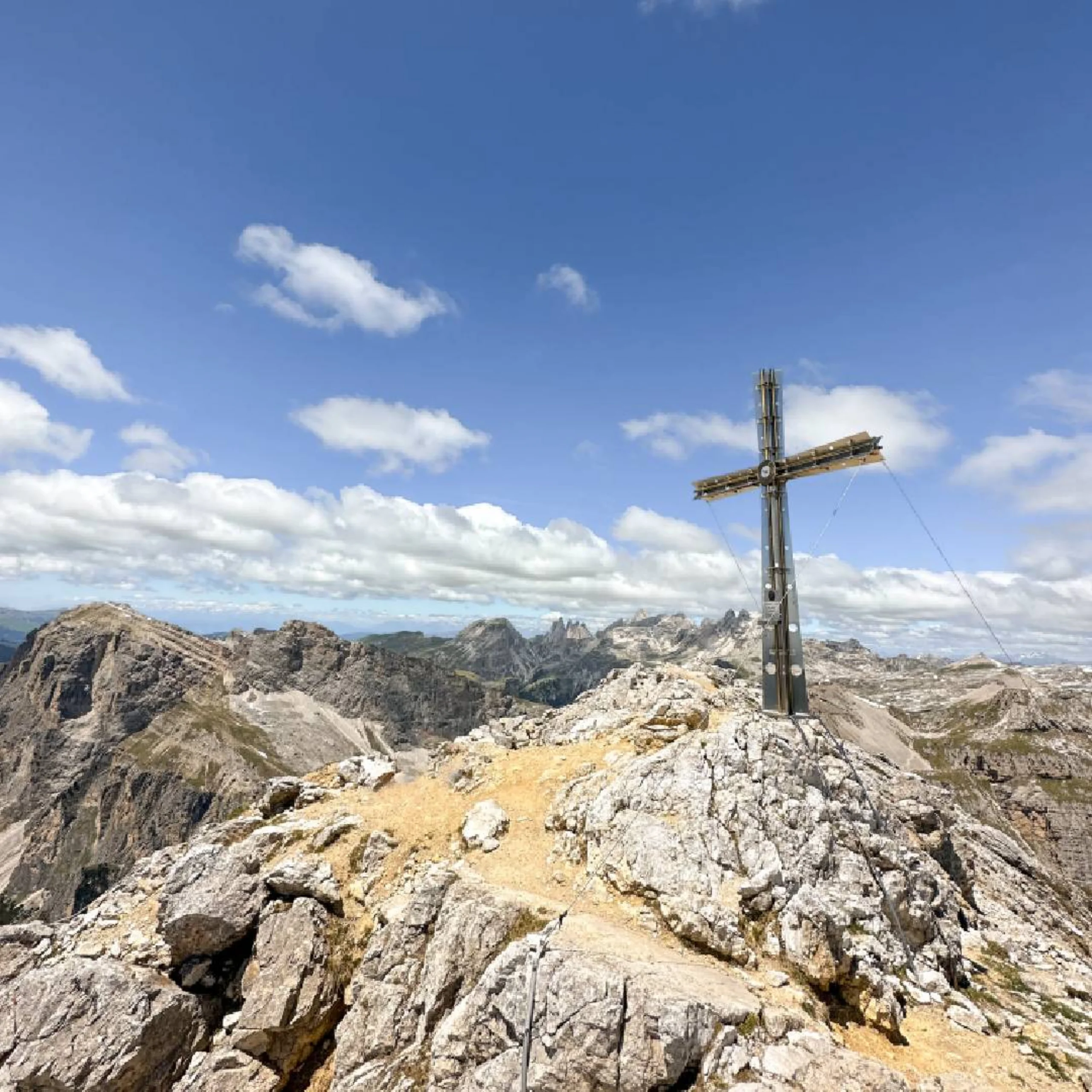 Una volta raggiunta la vetta, non vi aspetta solo un'elegante croce di vetta, ma anche un panorama mozzafiato: imponenti cime dolomitiche come il massiccio dell'Heiligkreuzkofel, il Sasso Lungo, il Sella, i Cir, il Gruppo Puez/Odle, il Geisler e molte altre svettano nel cielo. La discesa segue lo stesso percorso della salita.
