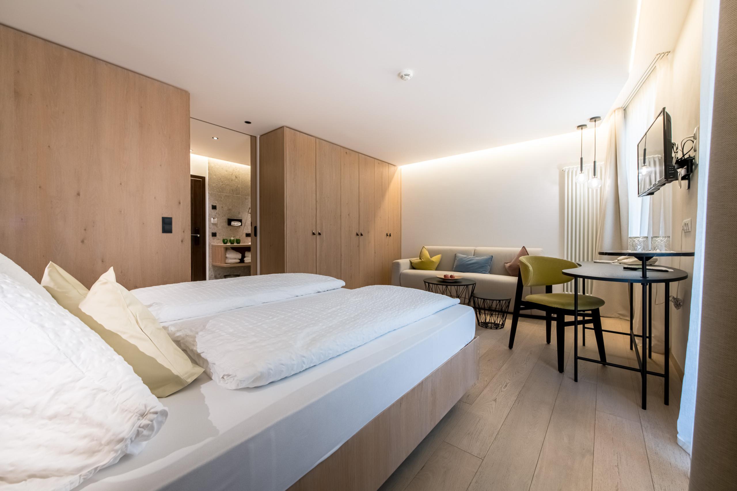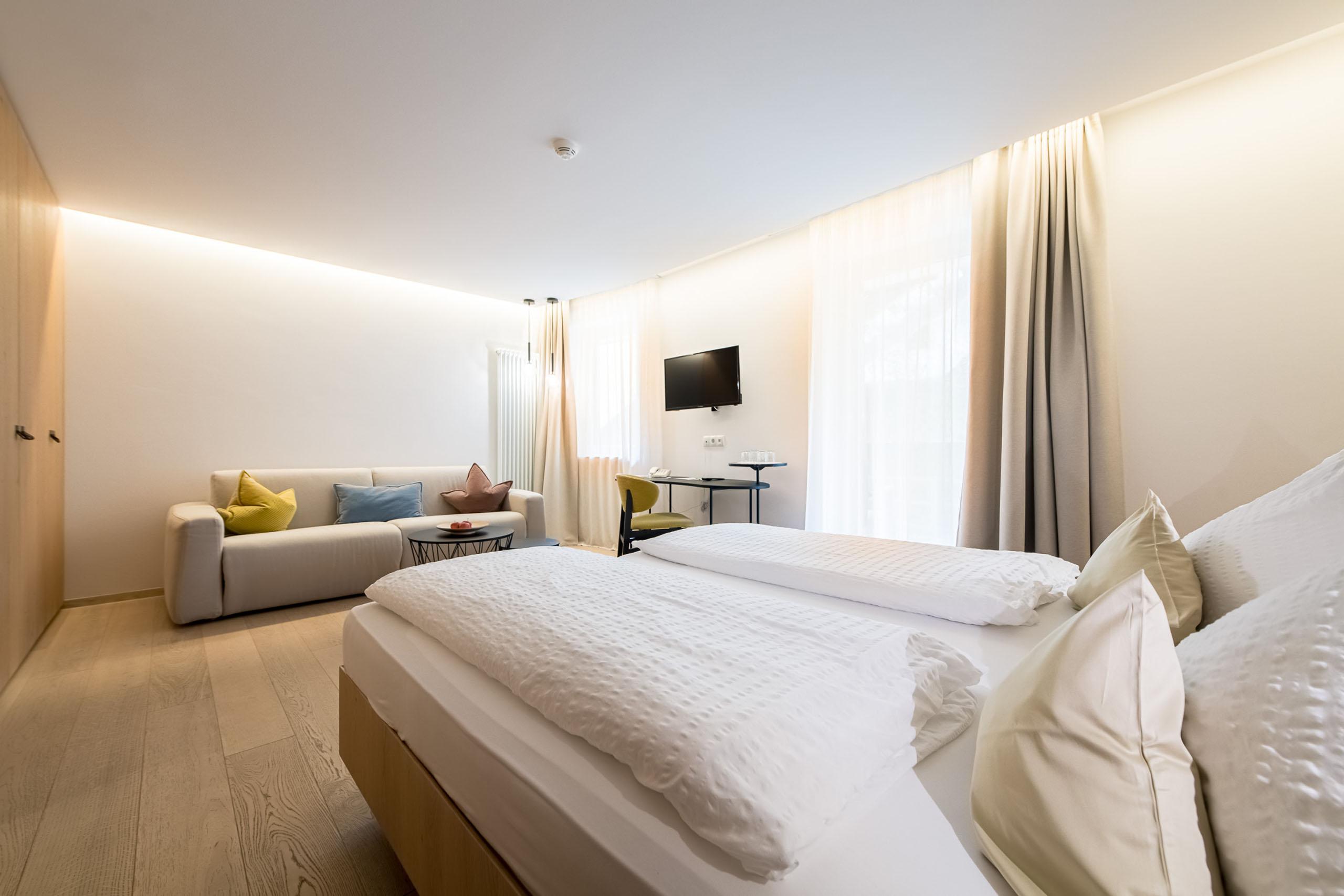 Großzügiges Doppelbettzimmer für 2 bis 4 Personen mit Westbalkon, Sitz- oder Couchecke, Holzfußboden, Sat-TV, Safe, Telefon, Radio, Minibar, Badezimmer mit Dusche, Haarfön, Kosmetikspiegel/ WC und Bidet separat.